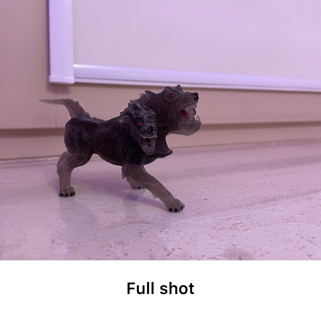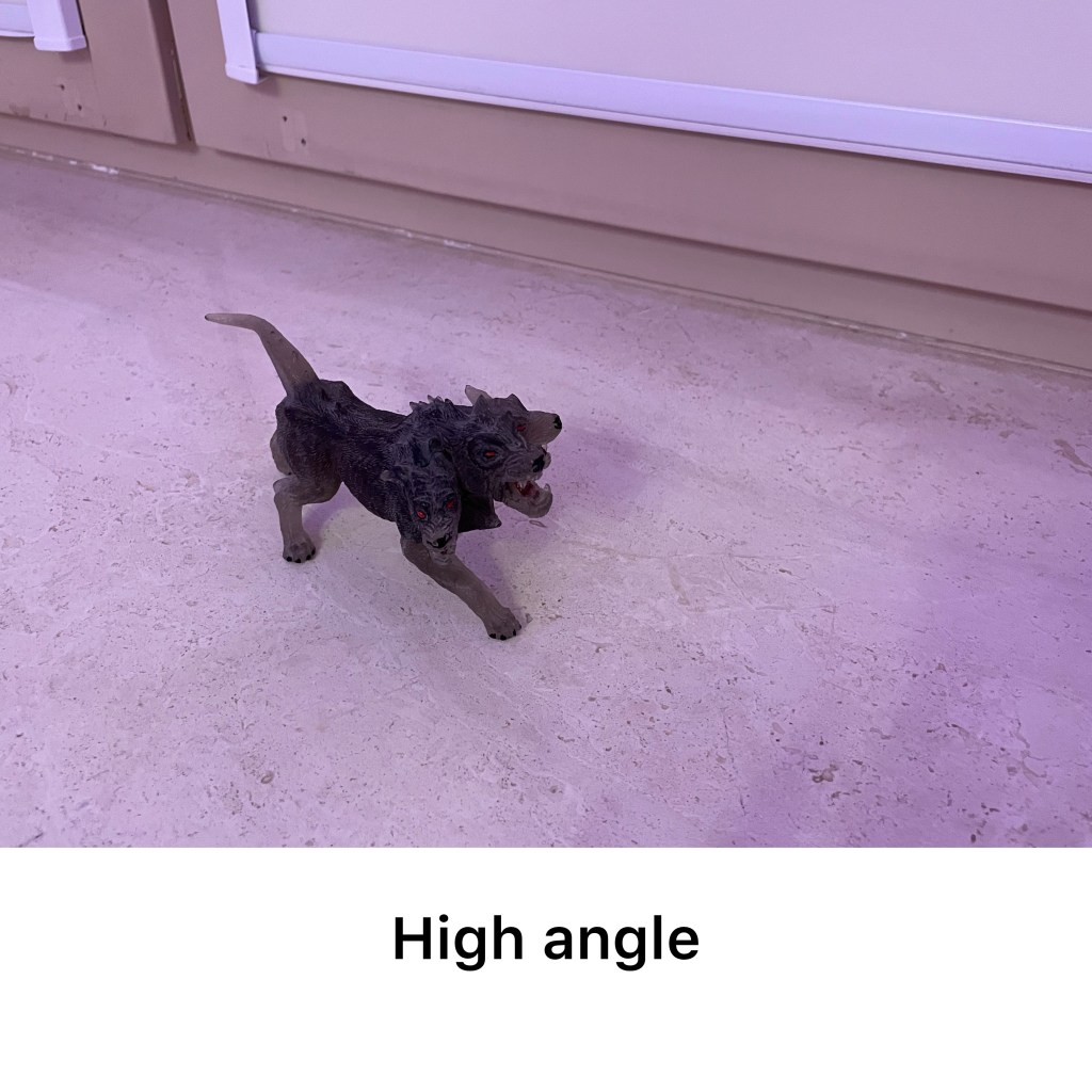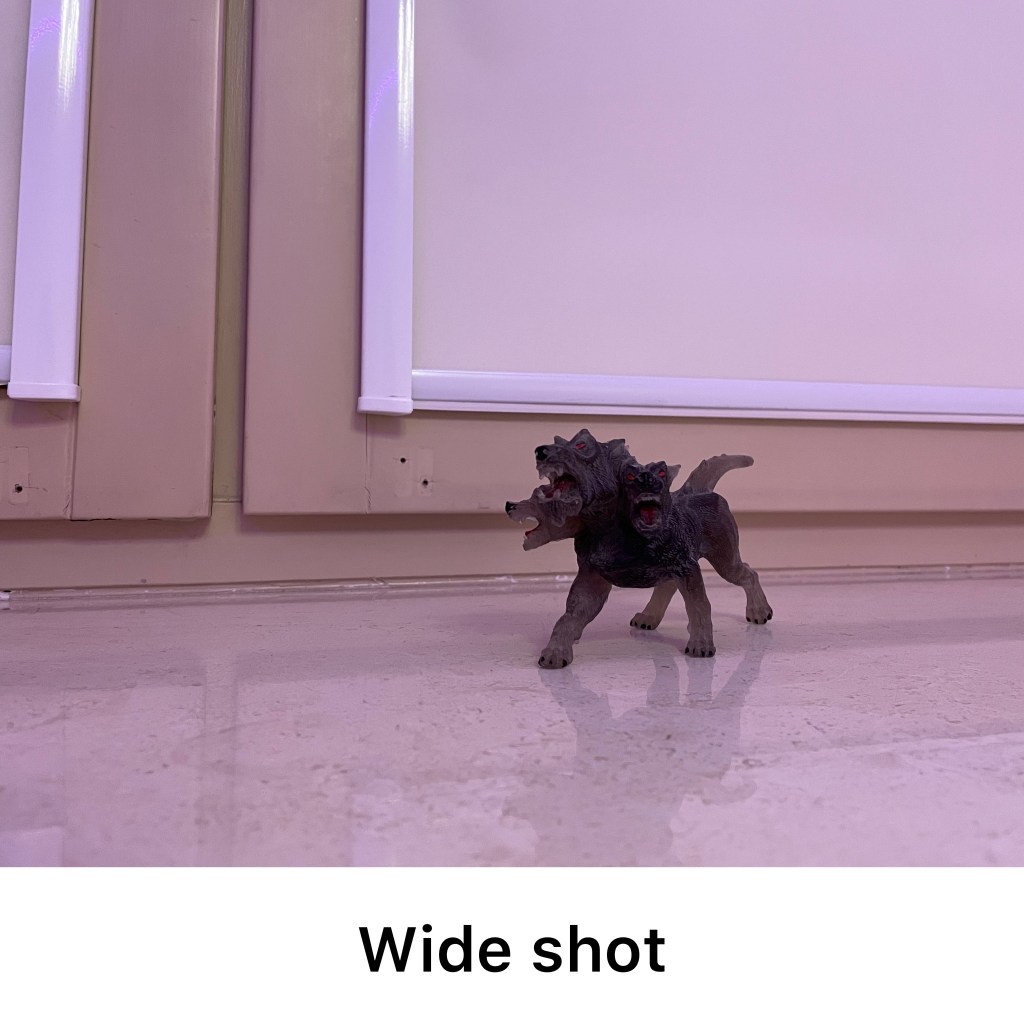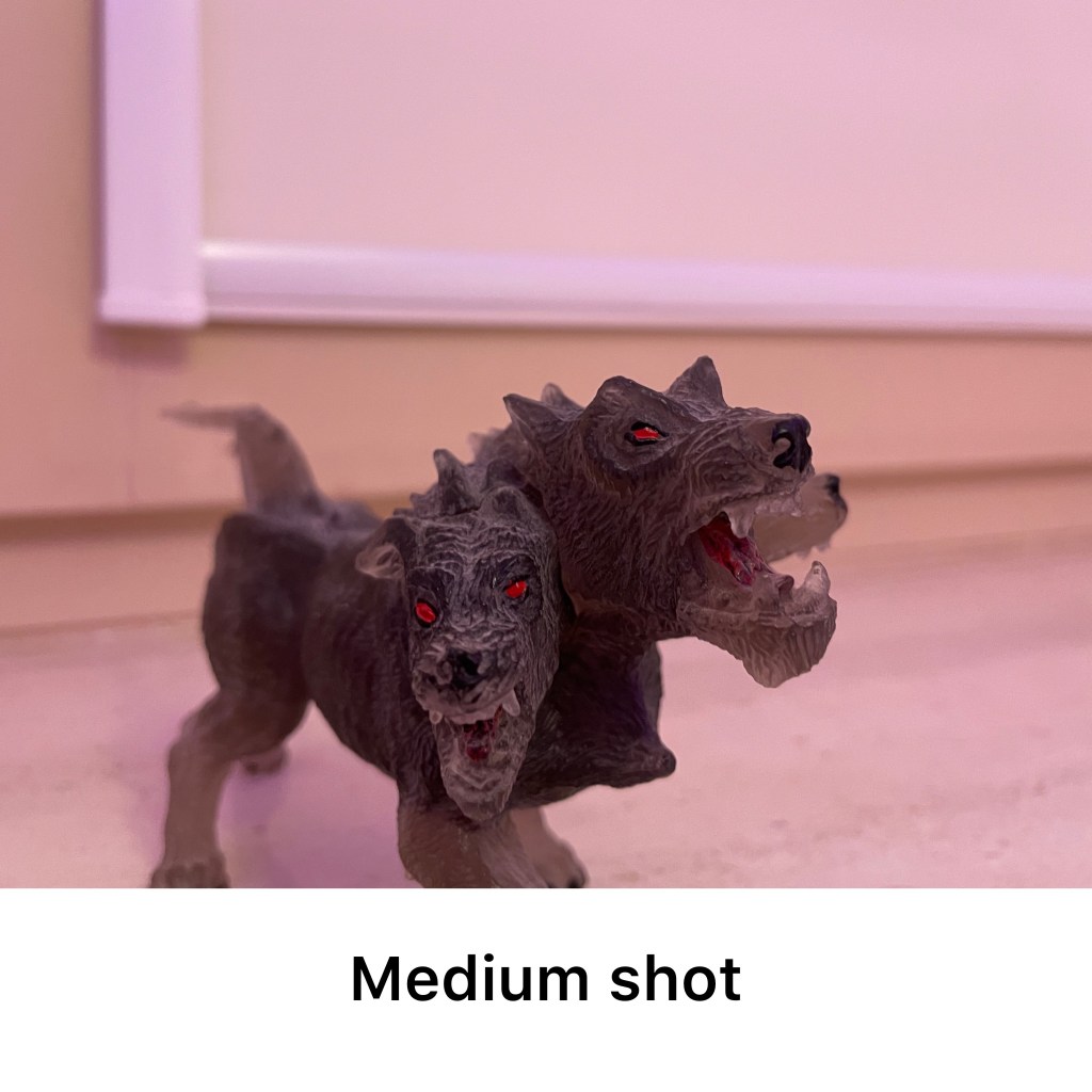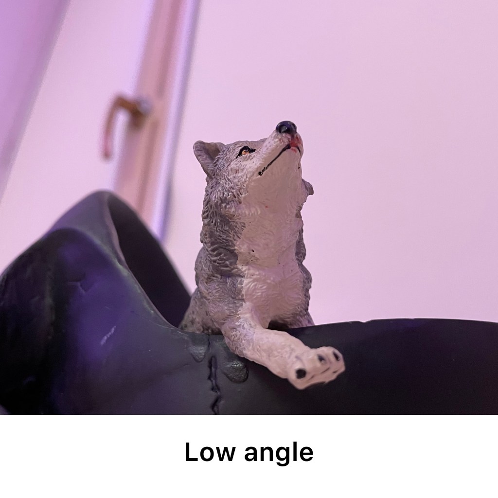 Before we started this task we have studied the camera topic more deeply so we can easily evaluate all the angles and shots and distinguish them. For a photo shoot I chose a solid animals toys including cat, wolf and a hellhound, and took some pictures following the task. As the location I chose windowsill, as it is quiet wide and spacious, and used my phone to take high-quality images.