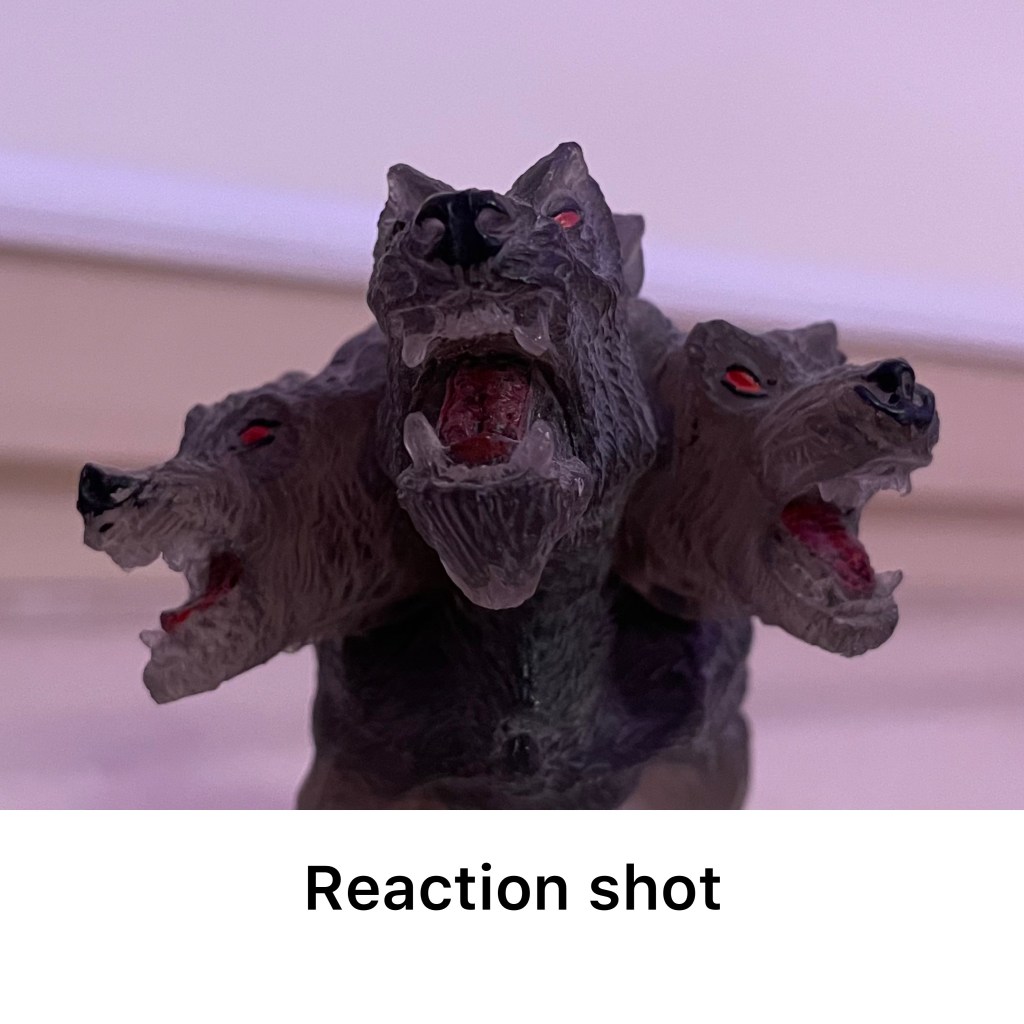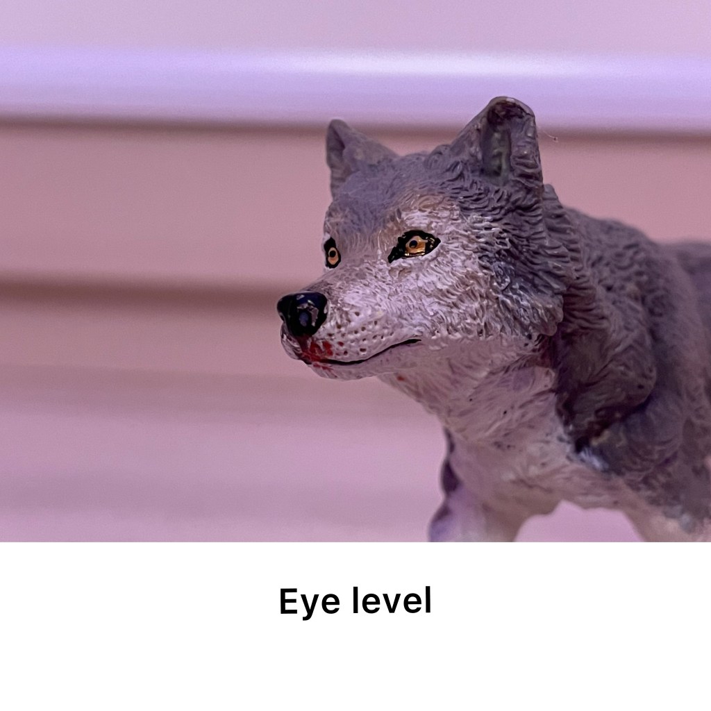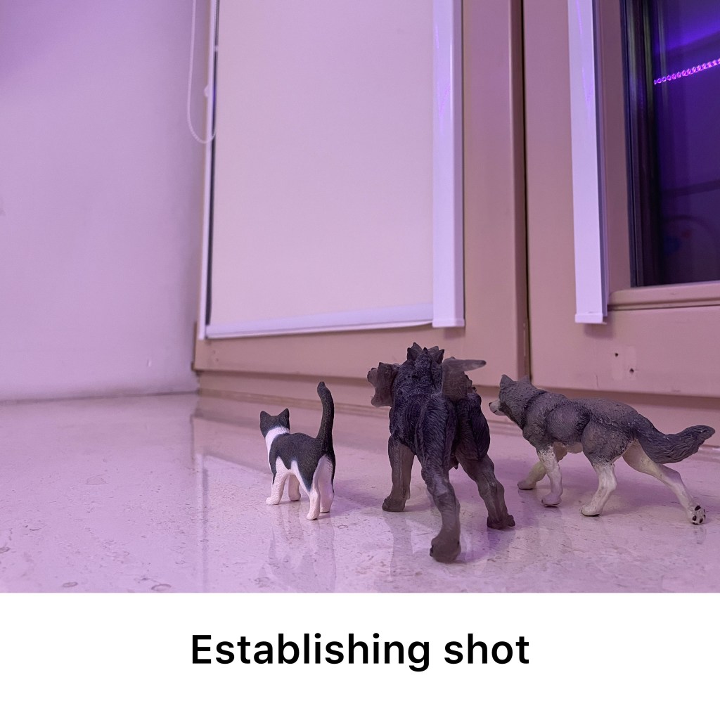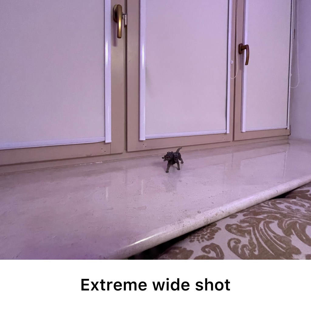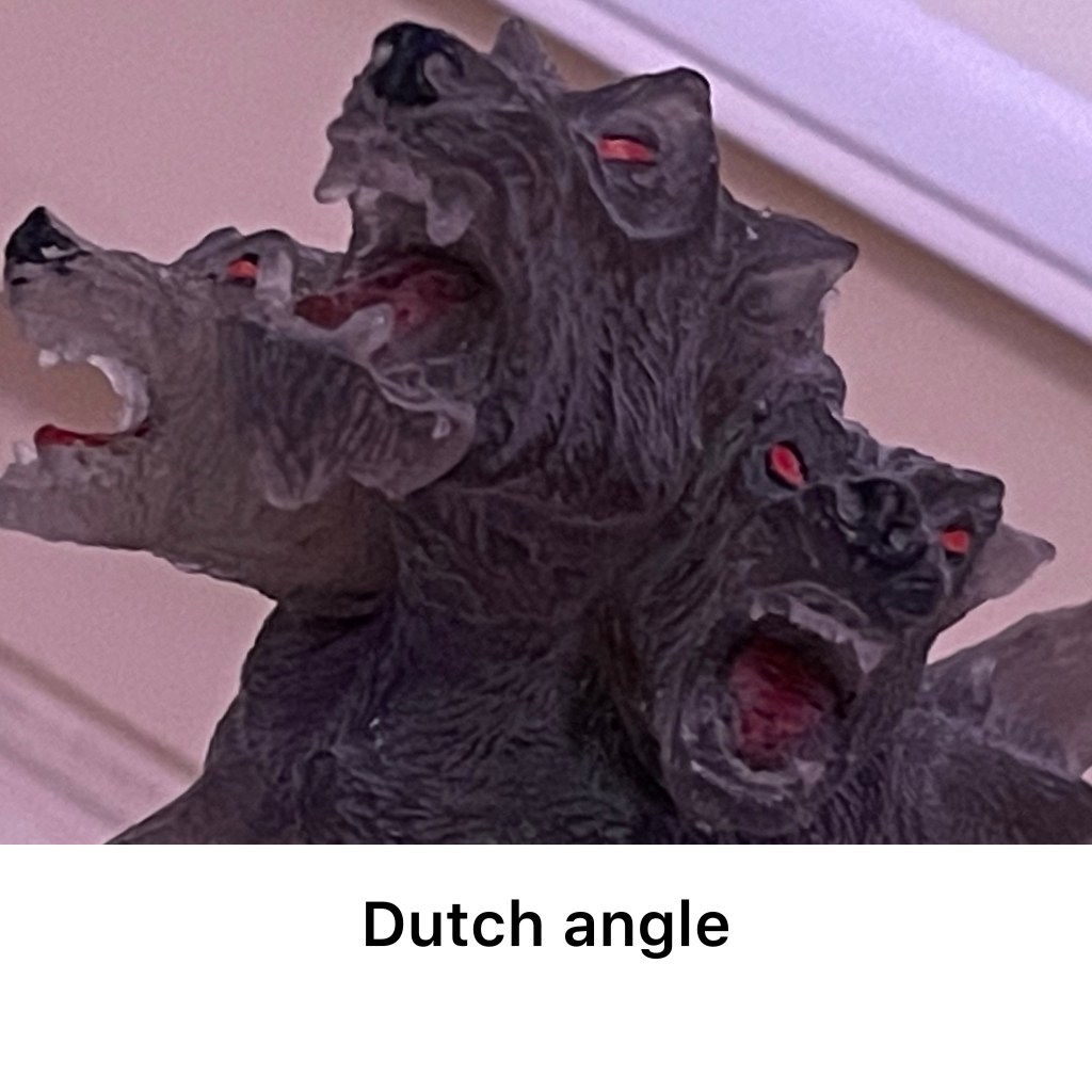Before we started this task we have studied the camera topic more deeply so we can easily evaluate all the angles and shots and distinguish them. For a photo shoot I chose a solid animals toys including cat, wolf and a hellhound, and took some pictures following the task. As the location I chose windowsill, as it is quiet wide and spacious, and used my phone to take high-quality images.