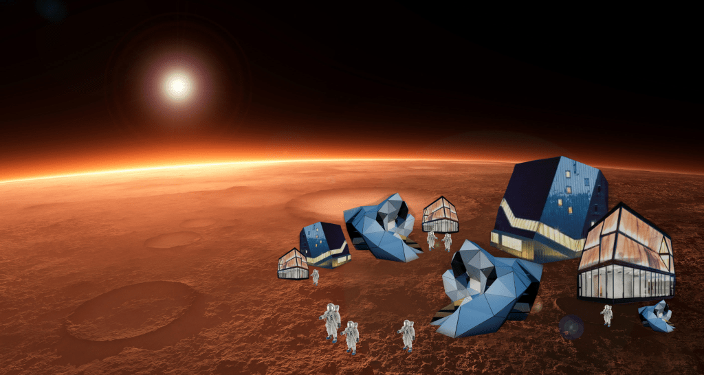 The point of the task was to convey the idea of life in the future based on space and life on other planets and to construct the digital version of how it would look like. We used the pictures of modern houses and people in spacesuits on mars. I was responsible for the picture on the outside of houses and visual representation of life in future, and Kate done the inside model of house.