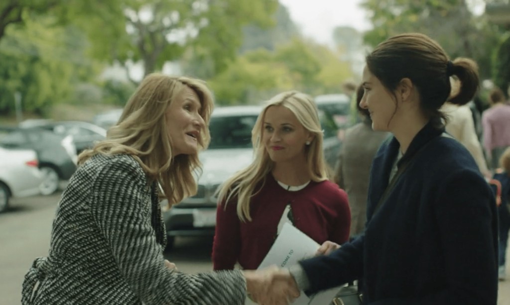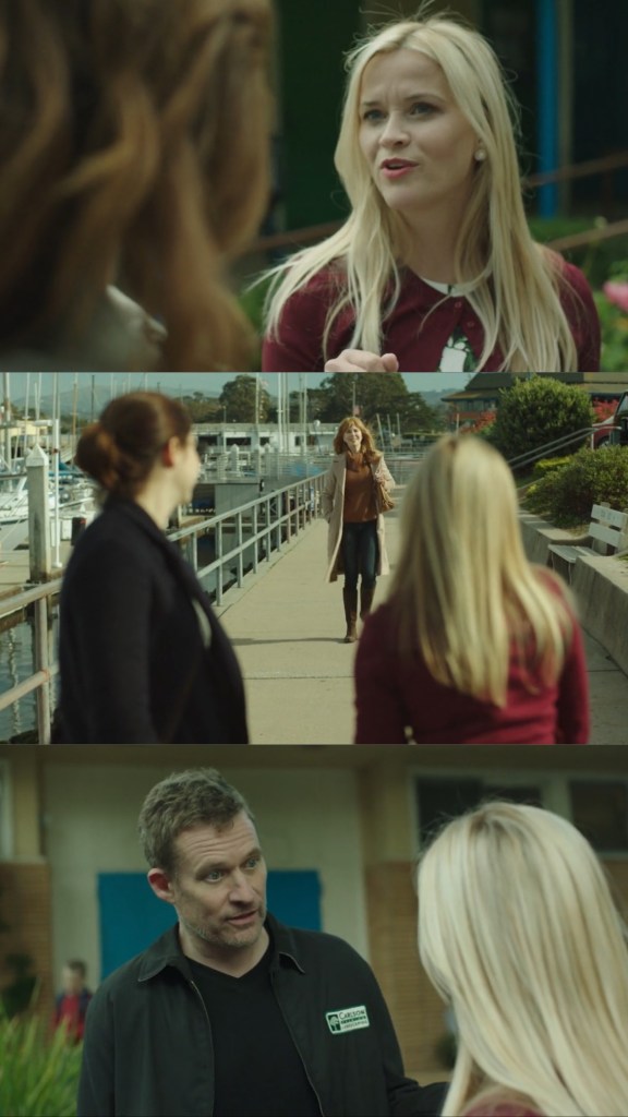 The extract shows the scenes with woman showing other woman the city, school and her friends. As it seems for the first view, the way she looked like contracts an opinion of a stereotype of blondes, who is obsessed with style and glamour, which is conveyed by her appearance. She is wearing a bright dress, which seems quite fashionable at first glance in the context of this film. She also wears a dark glasses, red jacket and nice shoes, which creates an opinion of a quiet fashionable woman, while red colour grabs an attention of audience and people surrounding her, what makes character’s MES look more feminine. Her voice is quite loud, what makes her character more vivid and communicative, as she knows most of the people in the neighborhood and starts a conversation with every acquaintance she meets. The second character is a basic girl with a grey simple sweater, ponytail, shoulder bag and black jacket and hair, those details makes her character looks ordinary and creates an impression of a woman who doesn’t know anyone around and is only adapting to a new area and knows only one person so far(blonde woman). Her voice is low and quiet, which makes her character more simple and basic, and dark coloured clothes and hair more dull. The background include school, masses of people, which creates an impression of beginning of school, because of adults and their children dressed in school uniforms. The weather and bright trees create showing end of the summer, as they also have mentioned the question such as “how was your summer?”.